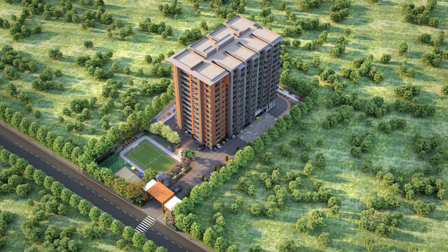 A thoughtfully planned gated community with Basement + Stilt + 13 floors and 115 Vastu-compliant units ranging 1400-1715 sq ft. Homes feature spacious layouts optimized for natural light, cross-ventilation, and efficiency, connected by landscaped greens and walkways to clubhouse and play zones.